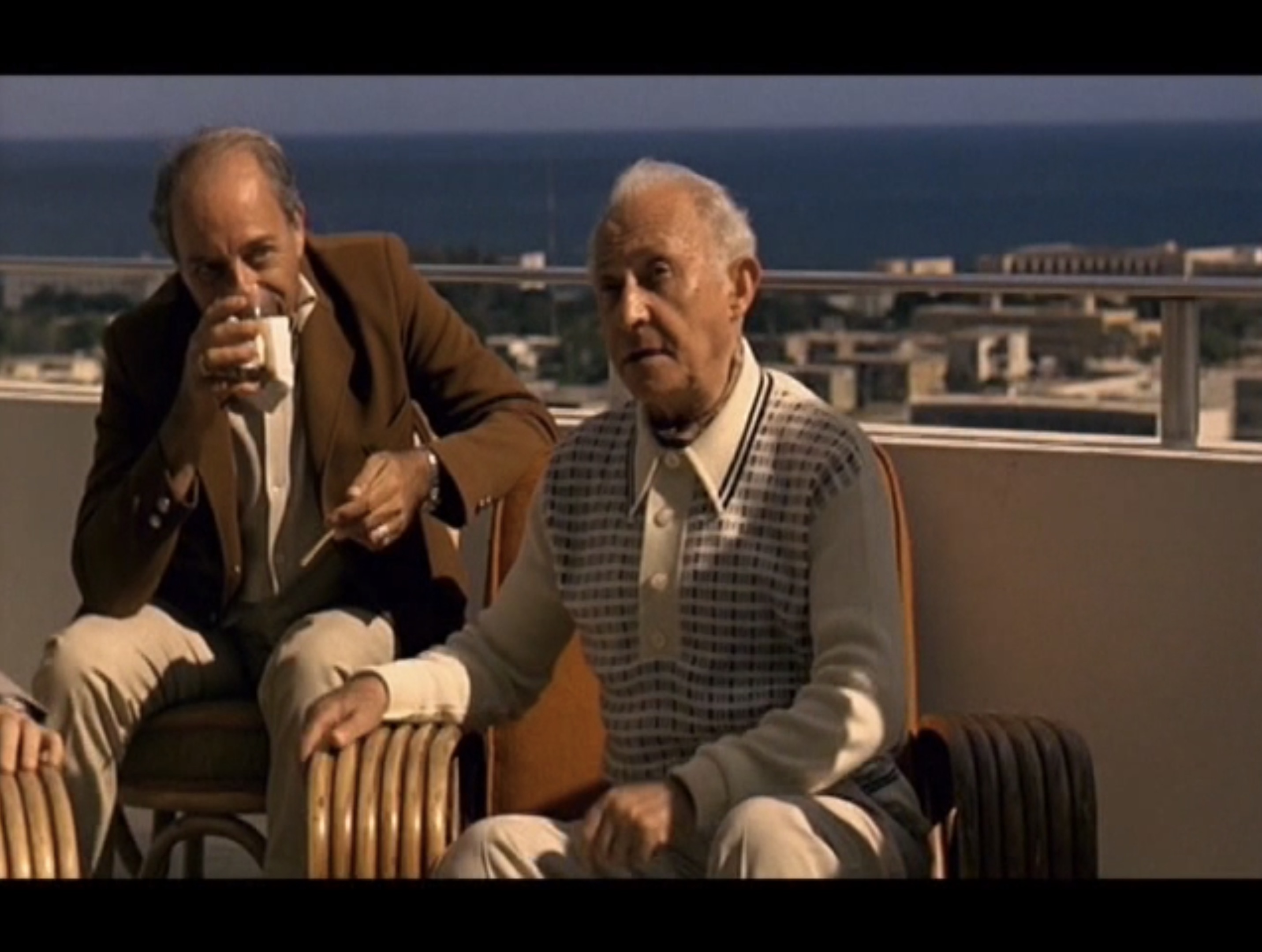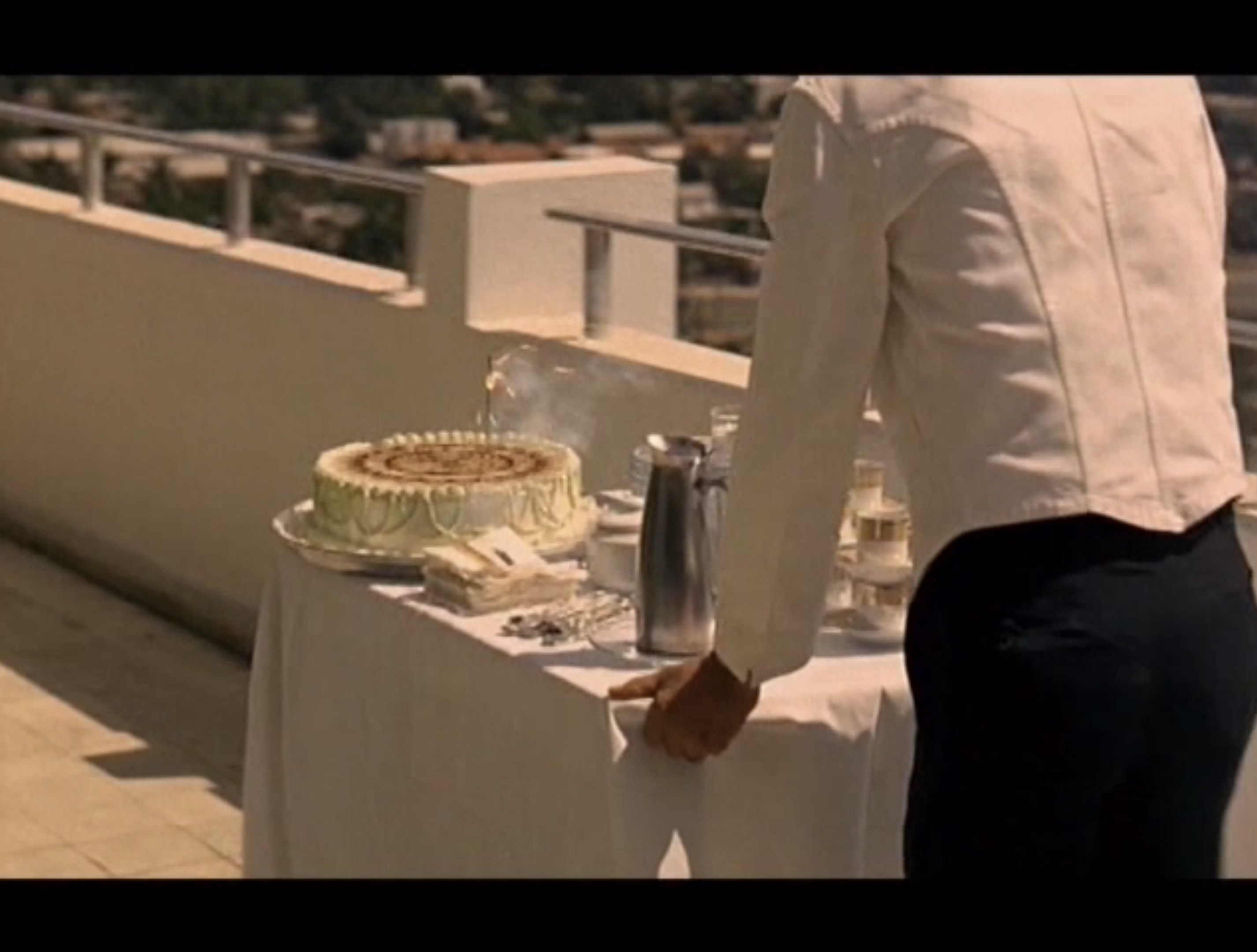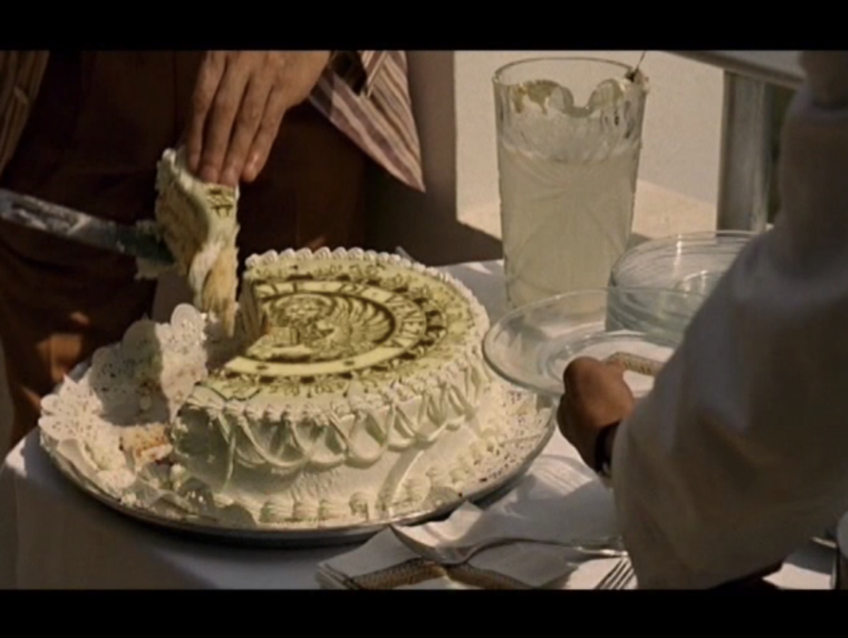 Extracto de la película “El Padrino II” del cineasta Francis Coppola, donde se presenta la repartición de una torta con el logo de la Bienal de Venecia en una reunión de cumpleaños.