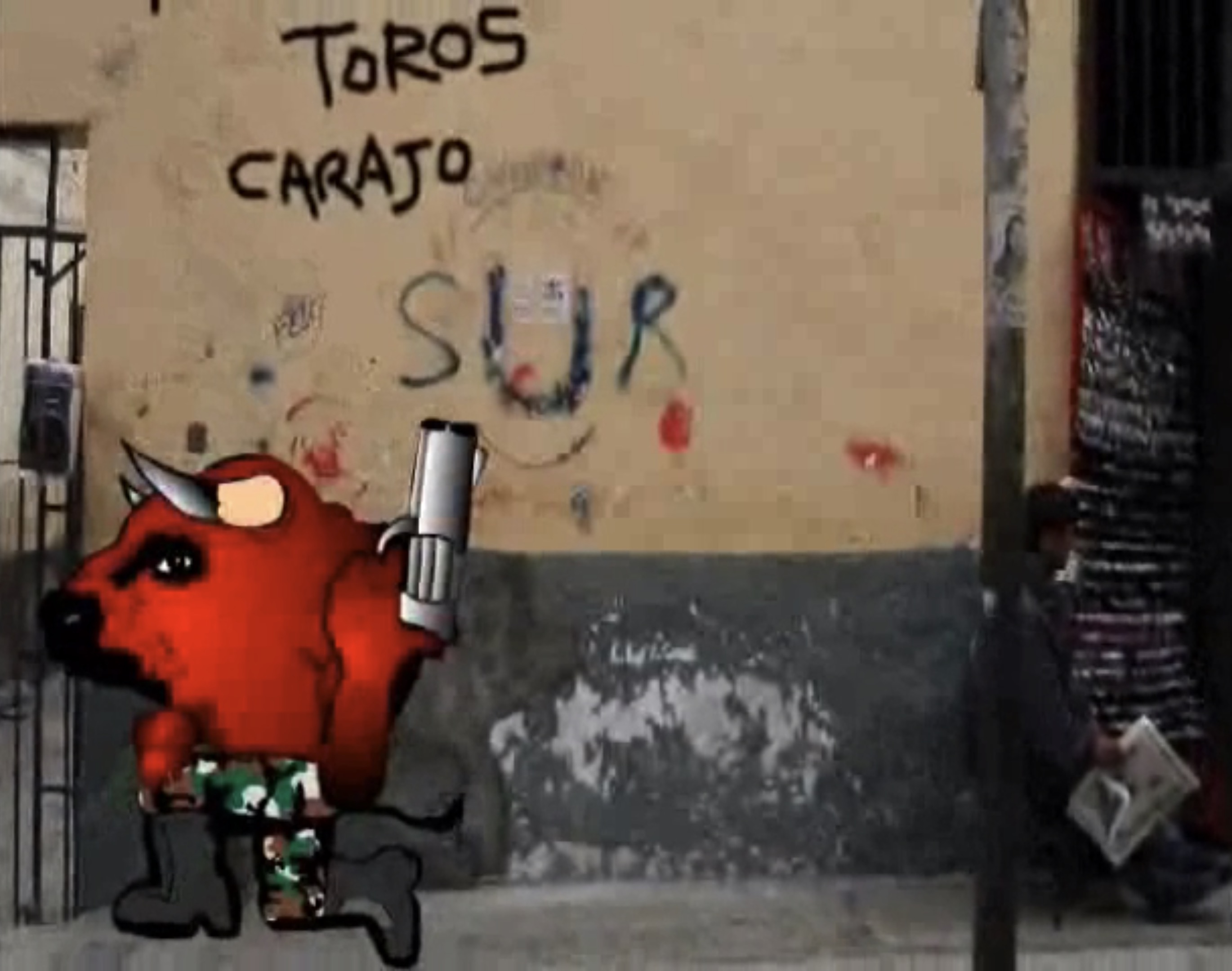 Un toro que nace de una pinta en una pared, que dia a dia se nutre de la violencia humana hasta ponerse rojo de ira solo para saltar del muro y arremeter con rabia contra todo quien se le cruce en su camino el cual ya esta trazado, y lo lleva hasta la plaza de acho...donde le espera un final distinto al que esperaba…