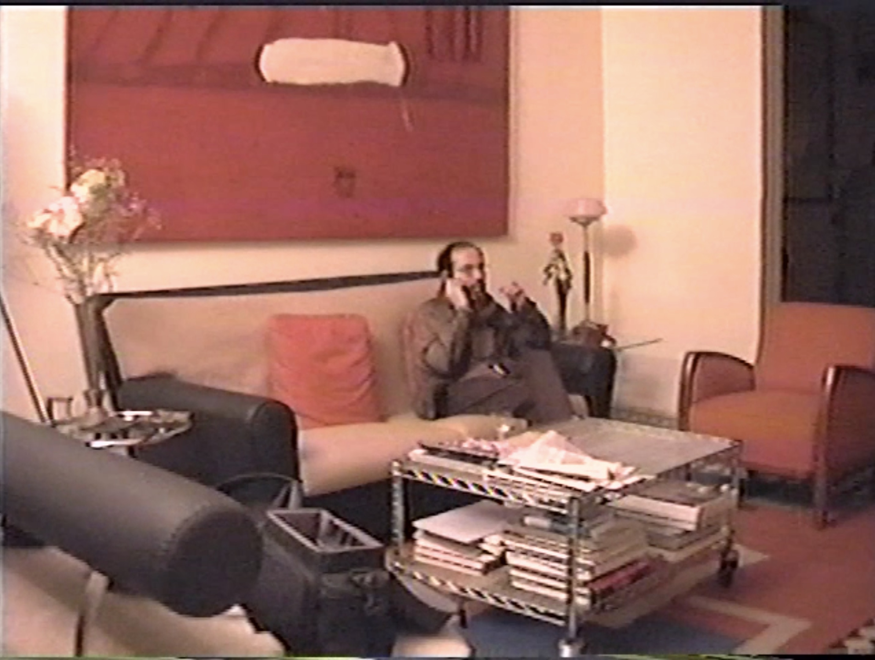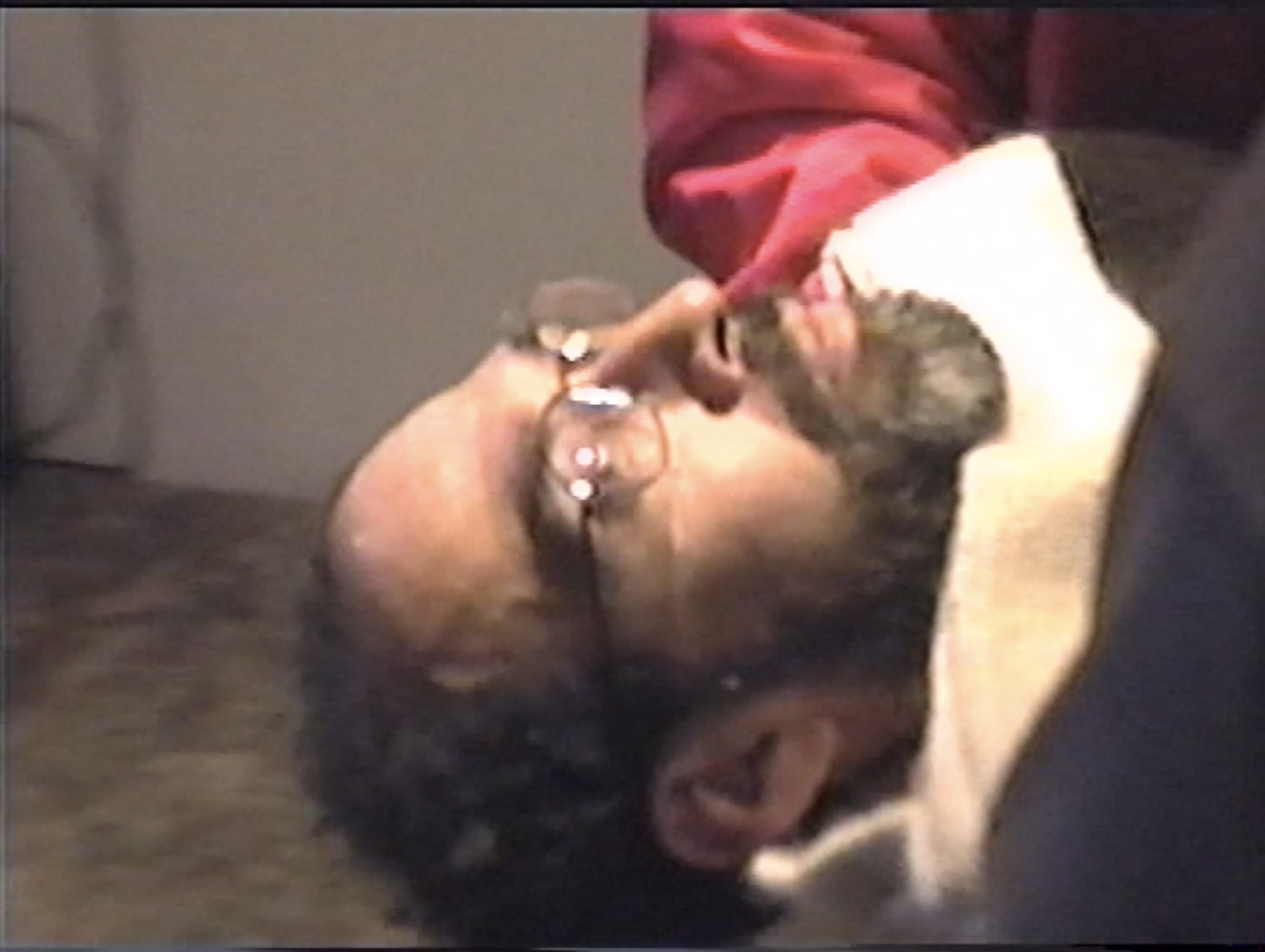Registro de performance del curador y critico de arte Jorge Villacorta, acción que consistía en envolverlo en una sabana y presentarlo en una galería.