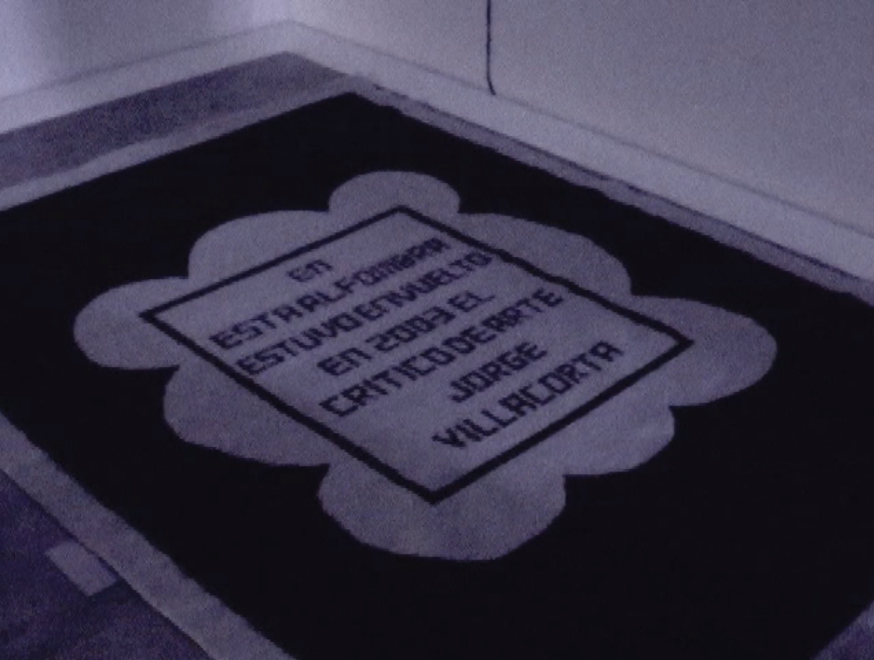 Una vez terminada la acción de envoltura, queda como testigo la alfombra abierta en el piso las tres semanas que dura la muestra. En dicha alfombra una vez extendida, se deja ver el siguiente texto (tejido como parte del diseño de la alfombra): En esta alfombra estuvo envuelto en 2003 el crítico de arte Jorge Villacorta.