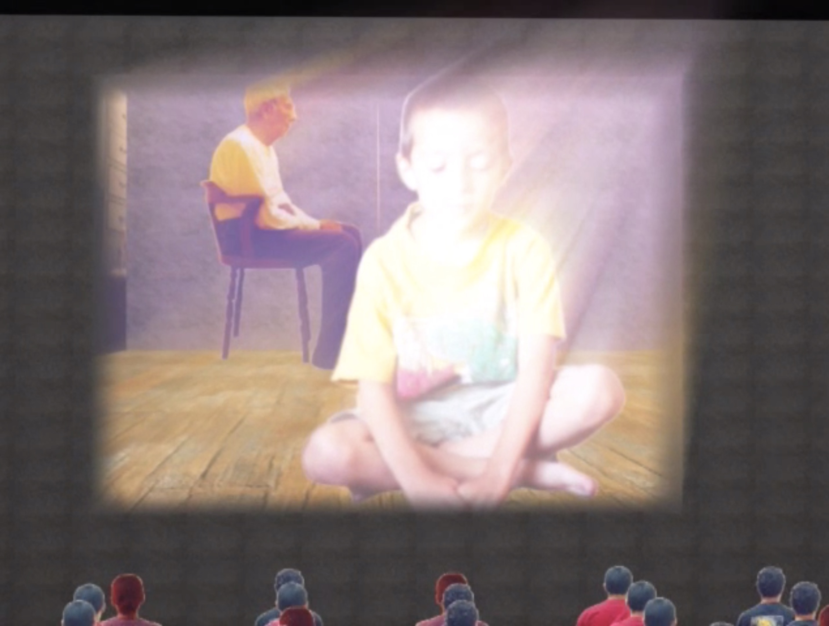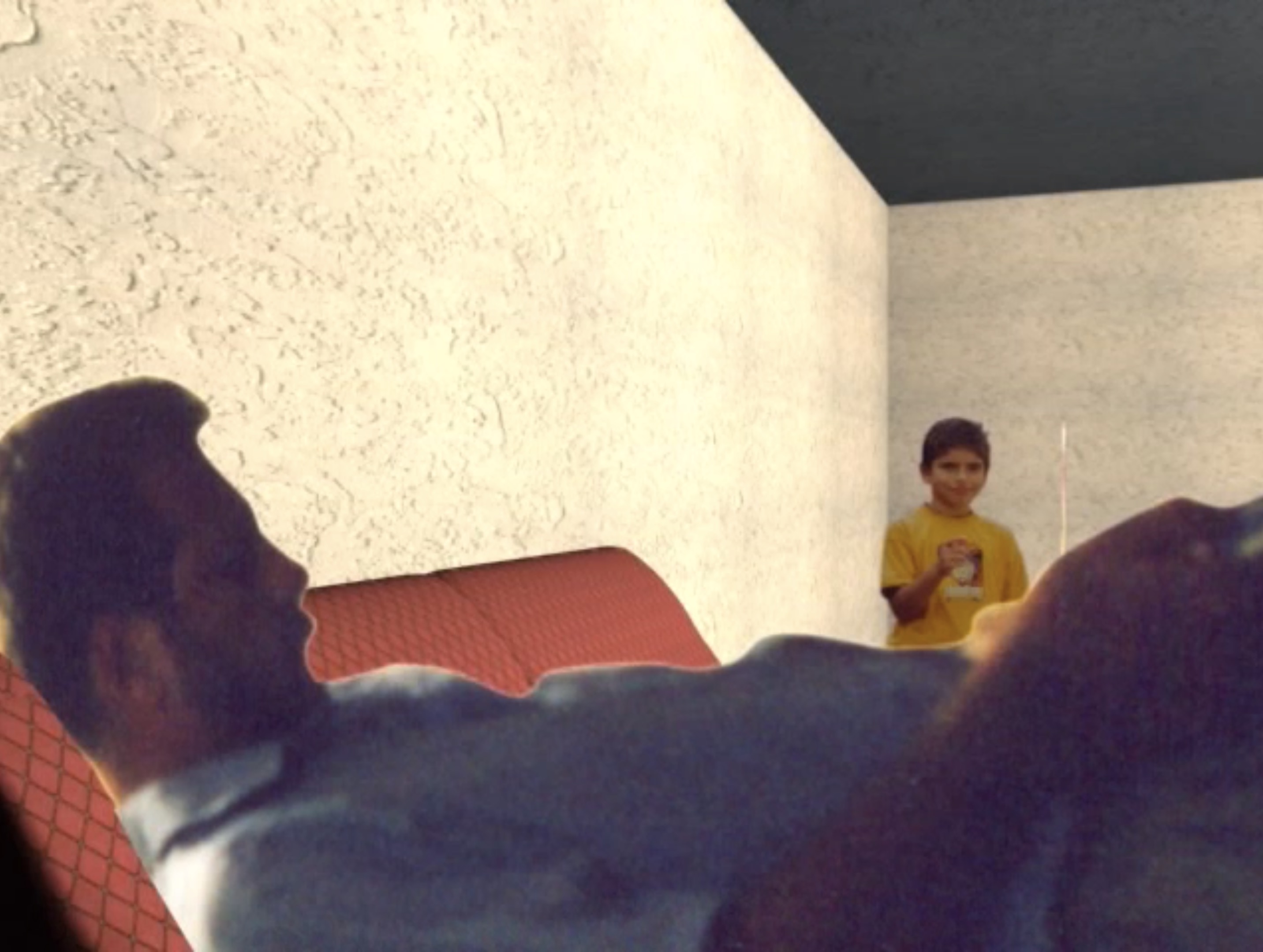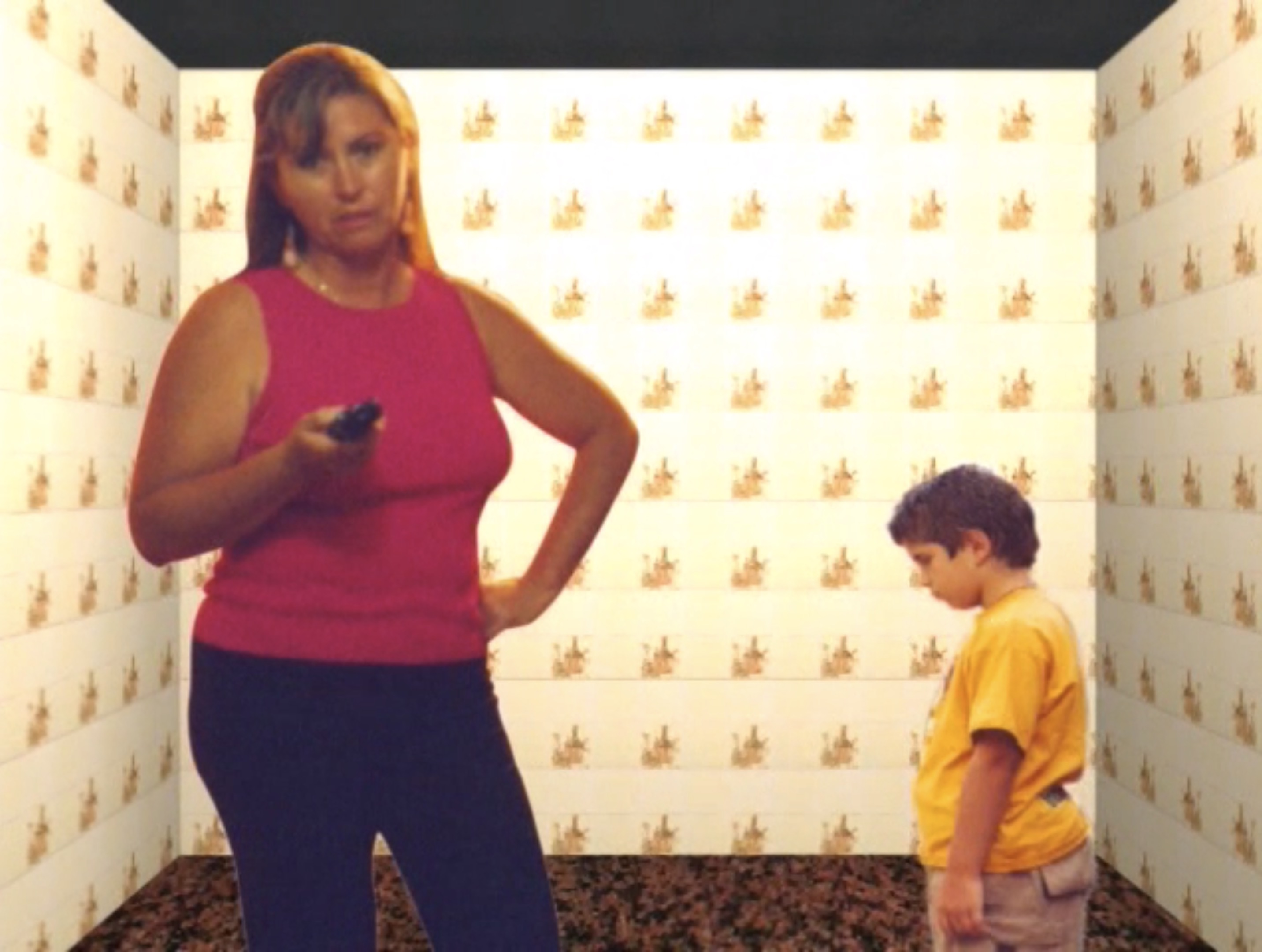 Animación con figuras tridimensionales y fotografías que muestra a un niño intentando llamar la atención de personas abstraídos con la televisión.