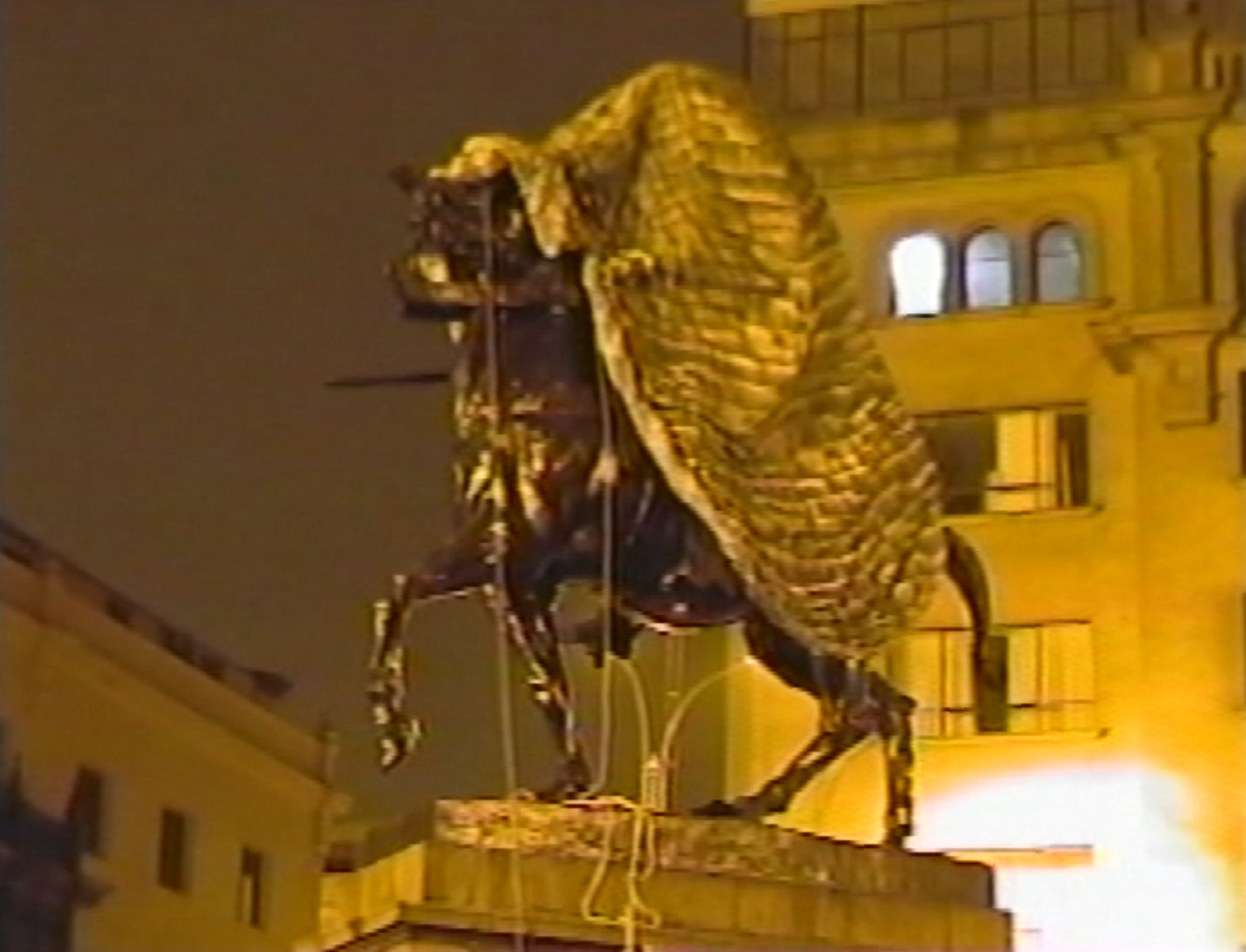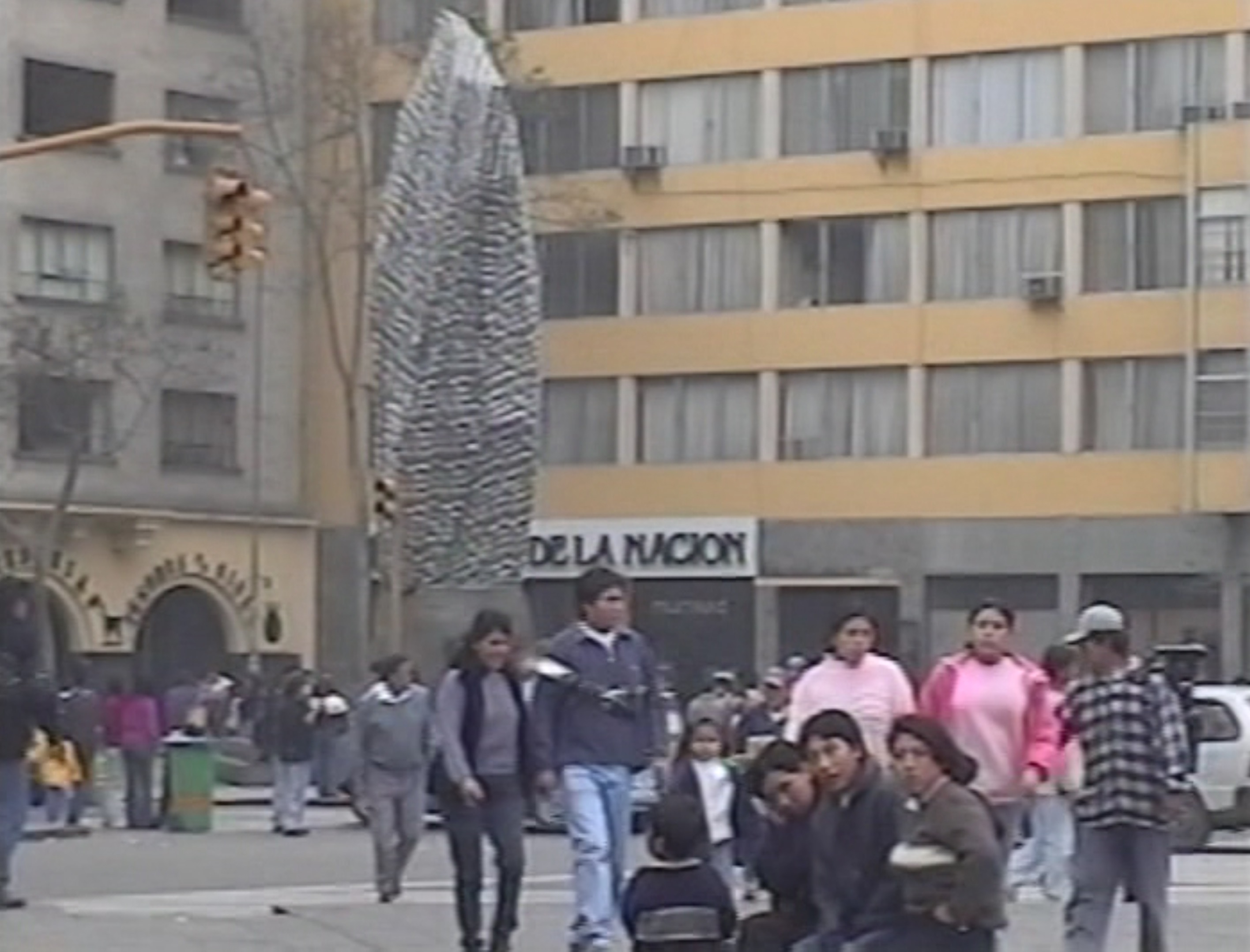 Registro de la acción en el monumento a Francisco Pizarro, otrora localizado en la Plazuela a un lado del Palacio de Gobierno. La escultura es cubierta totalmente con una larga tela estampada con diseños petreos de la arquitectura inca. Esta intervención coincidio con la celebración del Inti Raymi, fecha que señala el solstisio de invierno.