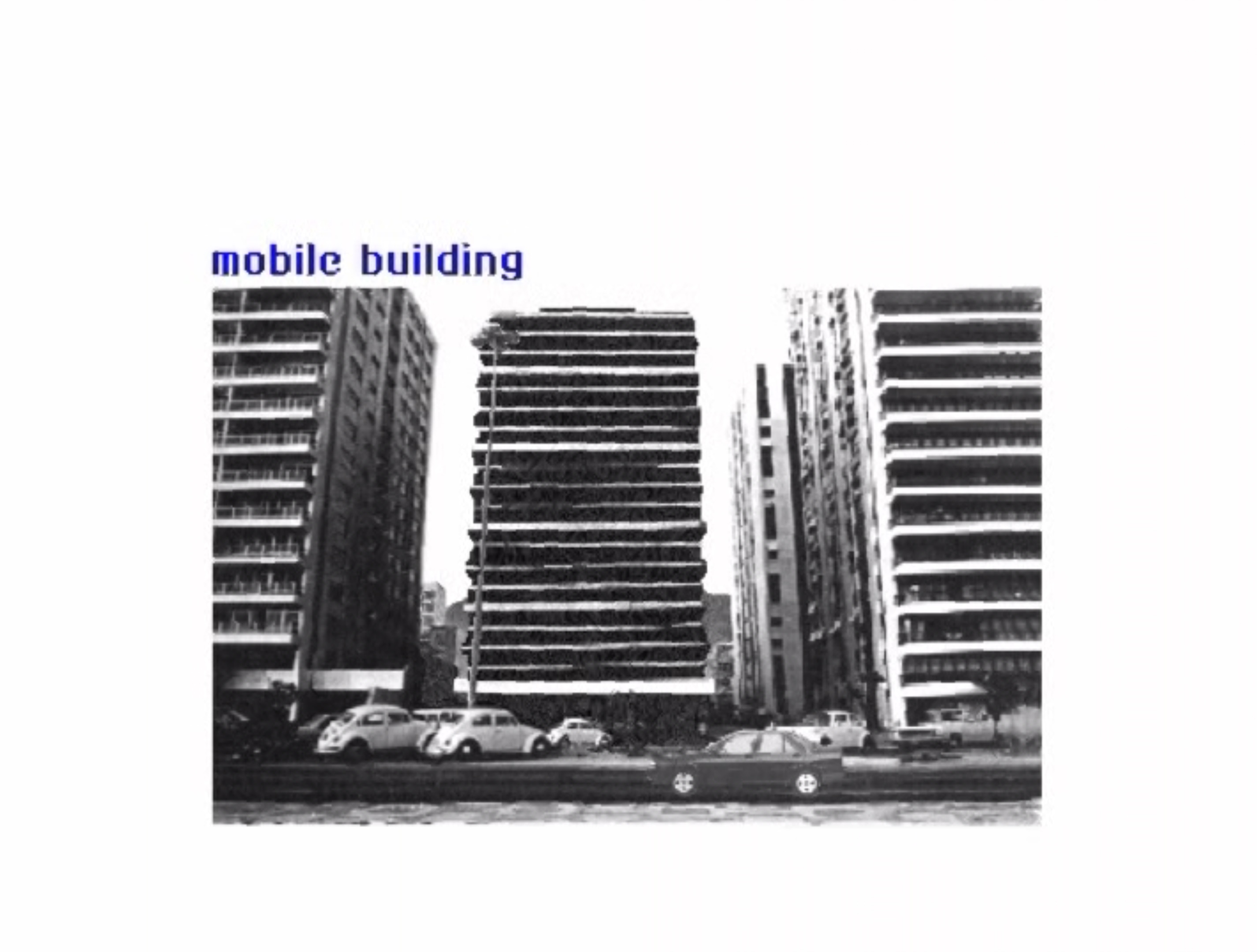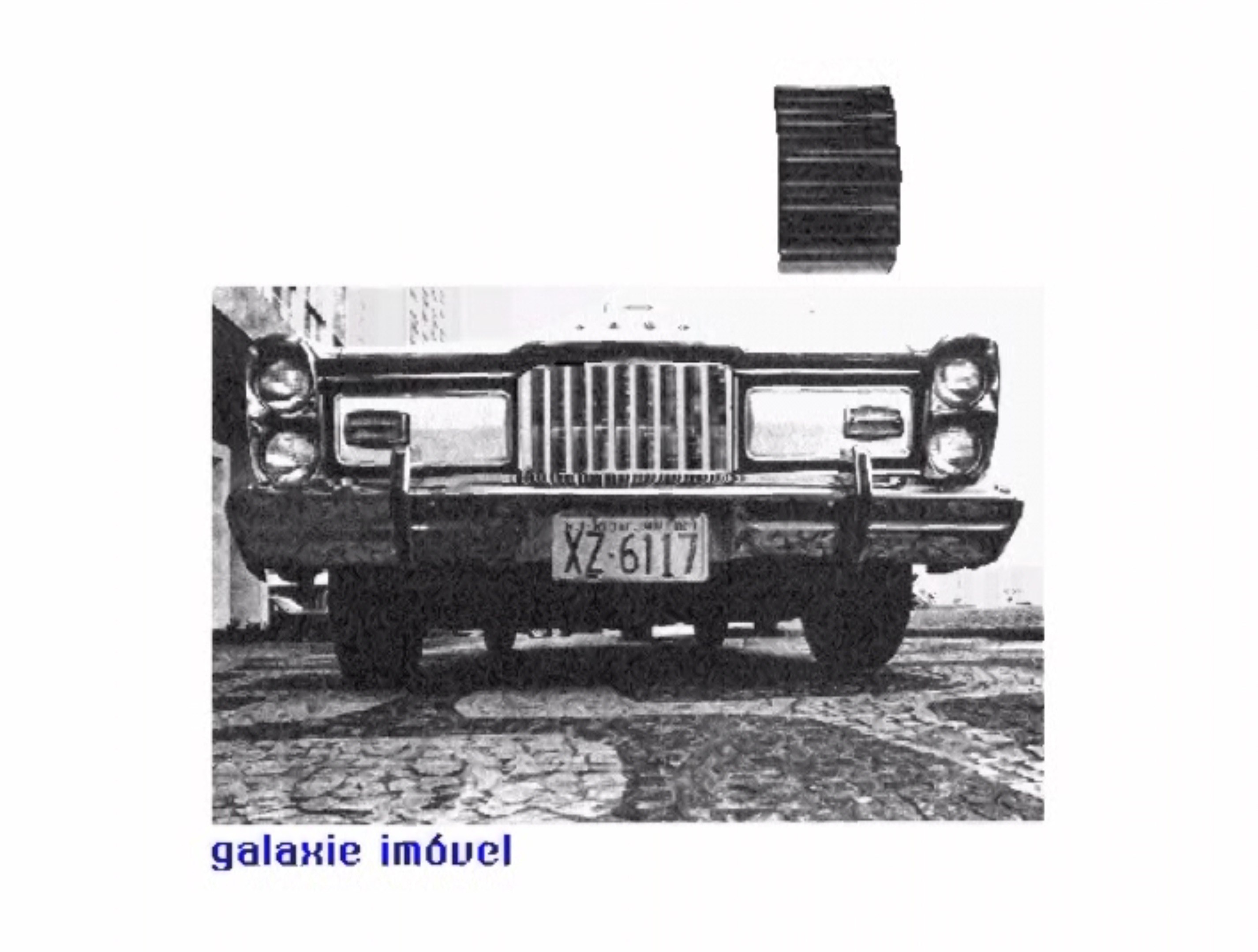 Las fotos originales fueron tomadas en 1975, año de fabricación del automóvil y año en que se culmino la construcción del edificio. Para esa época, estos dos objetos de lujo-un nuevo Ford Galaxia de color verde metálico y una vivienda en la Avenida Vieira Souto en Ipanema-se complementaban como aparentes símbolos de estatus o ascenso-movilidad-social. Tres fotografías-dos tomas de edificio una del automovil-han sido manipuladas como fotomontajes y agrupadas para formar esta pieza. Los dos objetos, a través de la oposición entre ellos, relacionan-en principio- la movilidad de los autos y la inmovilidad de los edificios(la palabra en portugués”imovel”-literalmente “inmovil”-también es usada como sinónimo de edificio, inmueble construcción). Pero casos típicos de (in)movilidad no se aplican estrictamente, ya sea al Edificio Galaxie o el Edificio Glaxie. Aquí, intercambios, cambios de alimentos, e inesperadas ocupaciones ponen a prueba estas oposiciones. Ni siquiera el generalmente exclusivo numero de identificación en la placa del automóvil resiste estas condiciones movibles de estabilidad, o inestables condiciones de inmovilidad. Este auto y este edificio están aquí como objetos no identificados. Mientras sean iguales, siempre son otros.