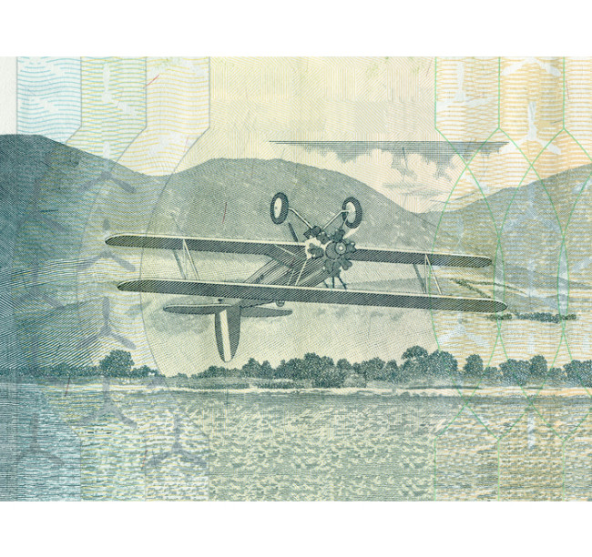 Imagen fija del fragmento del billete de 10 soles peruanos que muestra al héroe nacional de aviación José Abelardo Quiñones realizando uno de sus famosos vuelos invertidos a ras del suelo. Esta proyección proyectada en el techo del espacio de exhibición forma parte de una instalación que invita al espectador a tenderse en el suelo para observar la imagen desde allí.