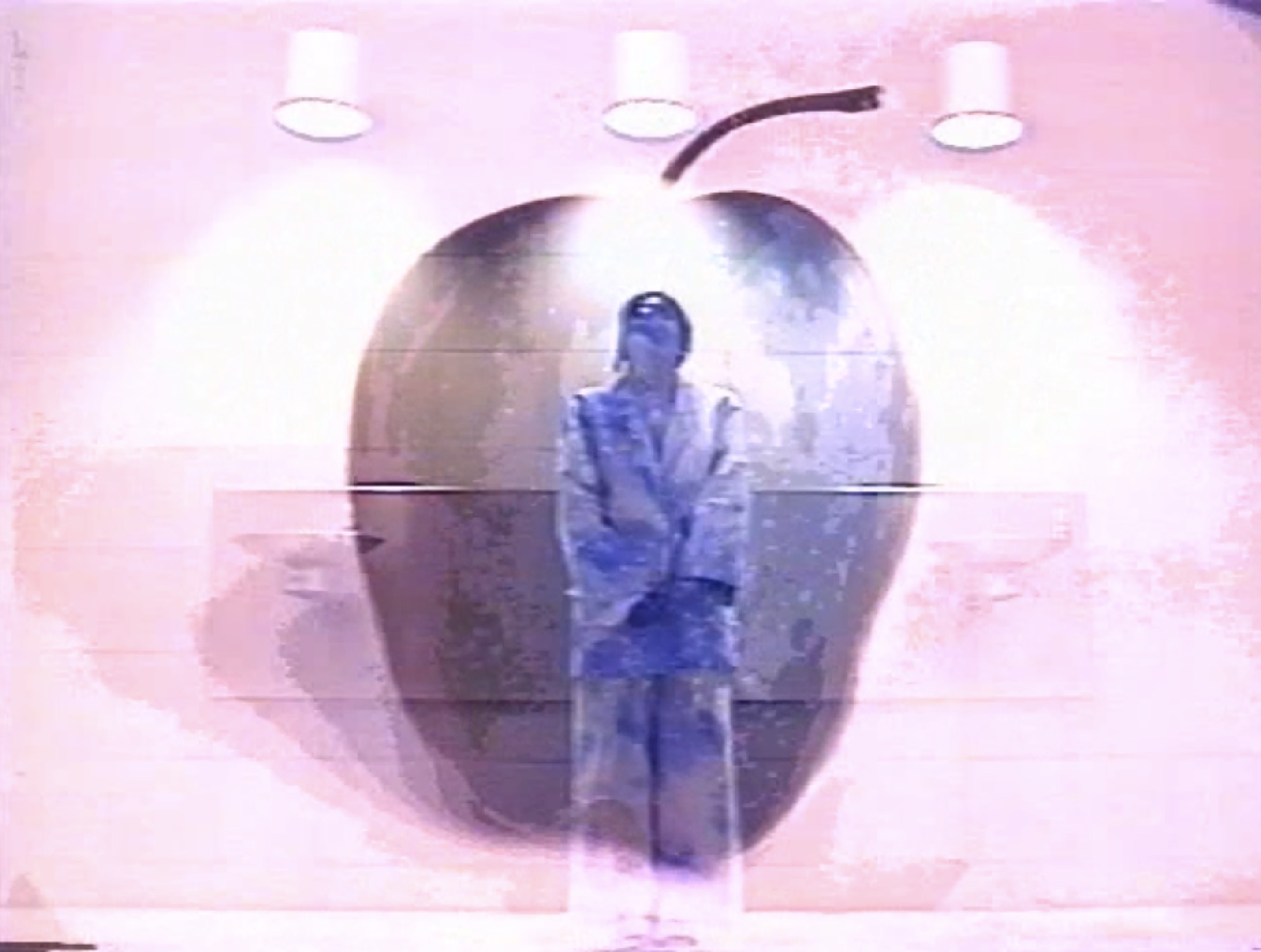Los interiores de una casa y una persona vestida con una bata pintada, se muestran intercaladas con la imagen de una manzana.